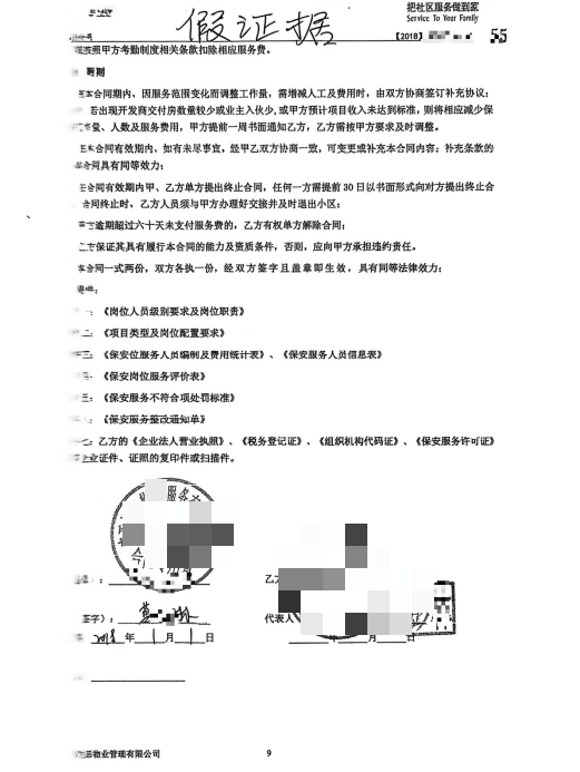 周先生进一步表示,庭审结束后,他发现庭审笔录中其辩论意见被部分删除,其中涉及同事证实公司未交付劳动合同的关键内容被遗漏,该内容直接关系违规用工事实认定。虽经其手写补充提交,但补充材料未被纳入庭审笔录归档。2019年11月,他调取案卷时发现,福来物业提交的《保安服务合同》缺失的第9页被单独夹入案卷,该页面纸张与其他页面不同且加盖双方印章,却未经庭审举证质证,明显系事后伪造添加。他当即要求档案室工作人员复印该页面与庭审笔录一起加盖骑缝章,留存作为对方伪造证据的关键凭证。
