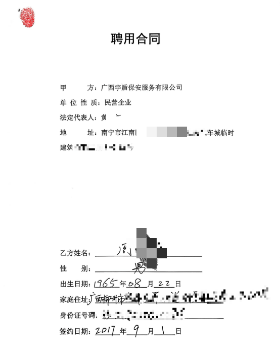 入职后,福来物业两次以欺诈手段要求周先生签订合同:2017年9月、2018年3月,先后要求其签订广西宇盾保安服务有限公司、深圳市中保亚太保安服务有限公司的劳动合同。两次合同均仅有周先生单方签字按手印,甲方无签字盖章,且合同原件从未交付其本人,周先生仅留存复印件作为证据。