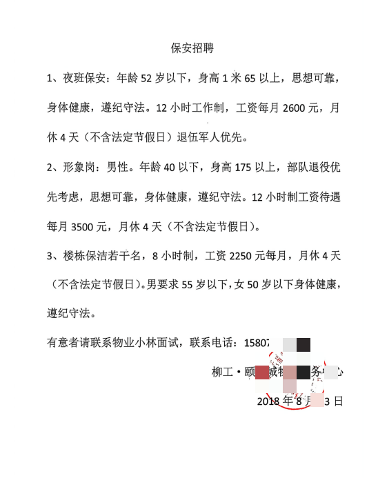 2017年9月1日,周先生通过福来物业公开招聘,入职该公司管理的柳工·颐华城小区担任秩序员(保安),负责西门消防通道车辆管控及指定单元电动车停放管理。双方约定:试用期工资2600元,转正后2800元,每日工作12小时、每月工作26天,工资以现金按月发放。