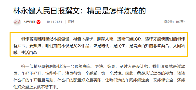 老戏骨林永健想必观众都不陌生,眼下他作为中国电视艺术家协会副主席,在《人民日报》发布自己的文章《精品是怎样炼成的》。
