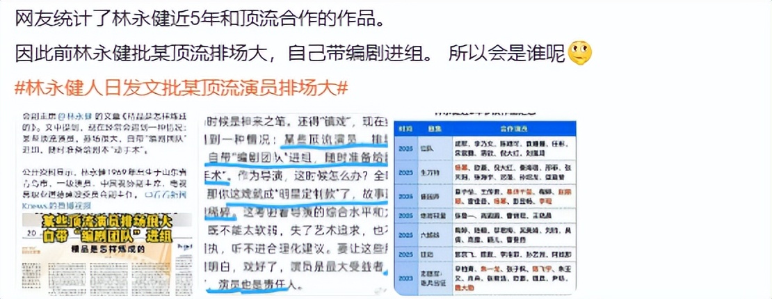 因此,网友们纷纷猜测林永健讽刺的顶流演员,是不是有一个具体的对象呢?