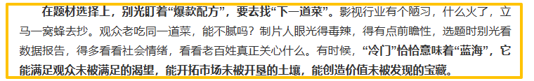 比如他指出:“影视行业有个陋习,什么火了,立马一窝蜂去抄。观众老吃同一道菜,能不腻吗?”