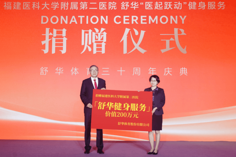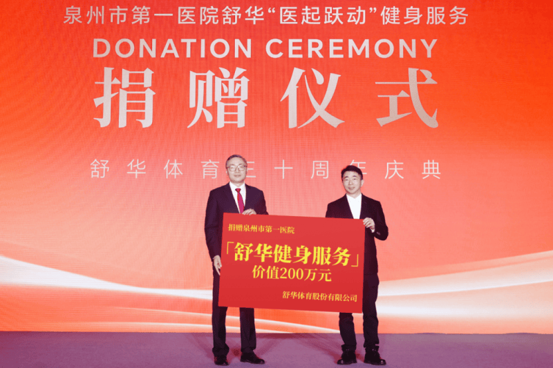 庆典伊始,舒华分别向泉州台商慈善总会、晋江市慈善总会各捐赠1000万元,用于支持本地医疗、教育、扶贫等慈善事业;同时向福建医科大学附属第二医院、泉州市第一医院共捐赠价值400万元健身服务,为守护人民健康的一线医护人员提供专业的健身支持,致敬他们的辛勤付出。此次捐赠总额高达2400万元,这不仅是舒华三十周年的一份厚重献礼,更是企业扎根社会、回馈社会的坚定承诺。