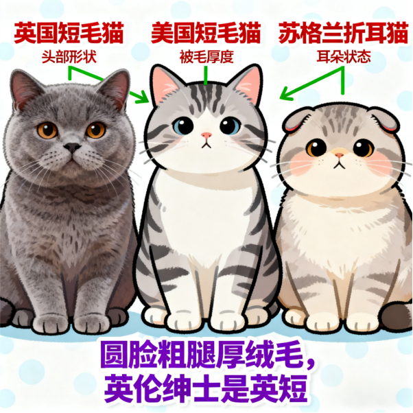 •与美国短毛猫的区别:英短头部更圆,被毛更浓密厚实,四肢粗短;美短头部呈椭圆形,被毛较薄有光泽,四肢修长;性格上英短更慵懒,美短更活泼。