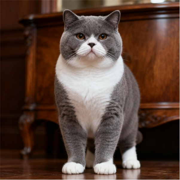 四肢粗短有力,与身体比例协调,骨骼密度极高,摸起来坚实如铁,这是其区别于其他短毛猫的显著特征。爪子圆形厚实,肉垫饱满有弹性,颜色与毛色基本匹配(如蓝猫爪垫为灰蓝色,白猫爪垫多为粉色)。尾巴长度约为体长的 2/3,基部粗壮,向尾尖逐渐变细,覆盖浓密短毛,静止时自然下垂,摆动幅度小,符合“沉稳内敛”的品种气质。