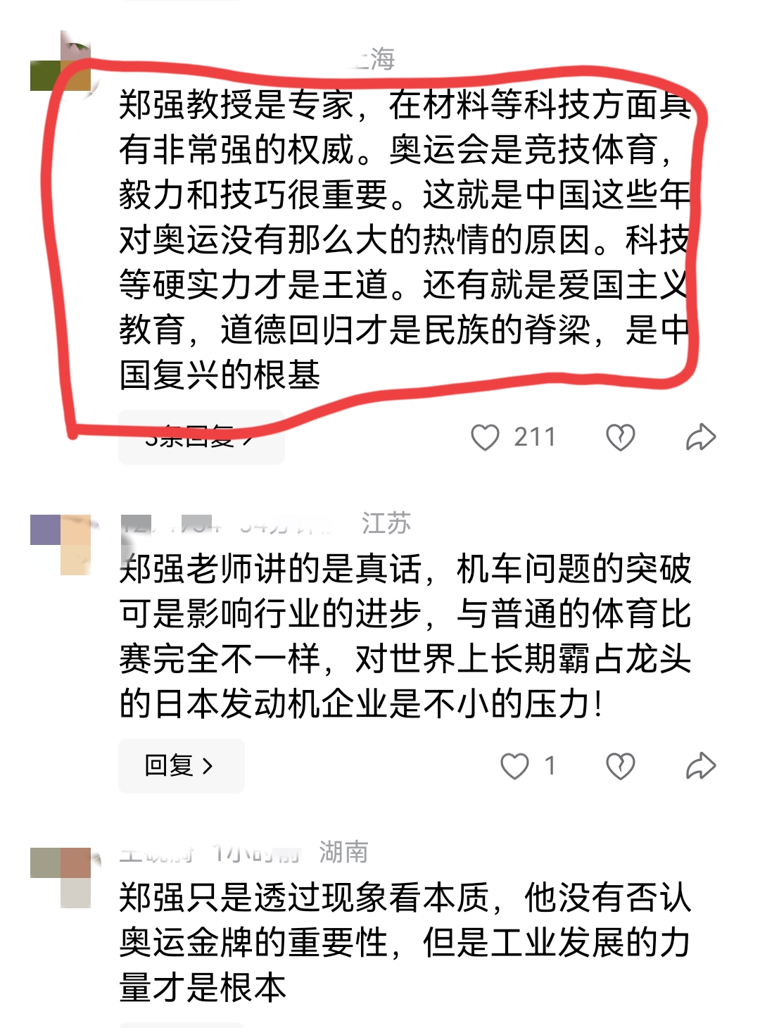 网友:郑强教授是领域内的专家,在材料等科技方面具有很高的权威性。奥运会侧重于竞技体育,强调毅力与技巧的运用。这也是近年来中国对奥运会的关注度有所下降的原因所在。相比之下,以科技为代表的硬实力更为关键。同时,加强爱国主义教育、让道德观念回归,才是民族的脊梁,也是中国复兴的根本所在。
