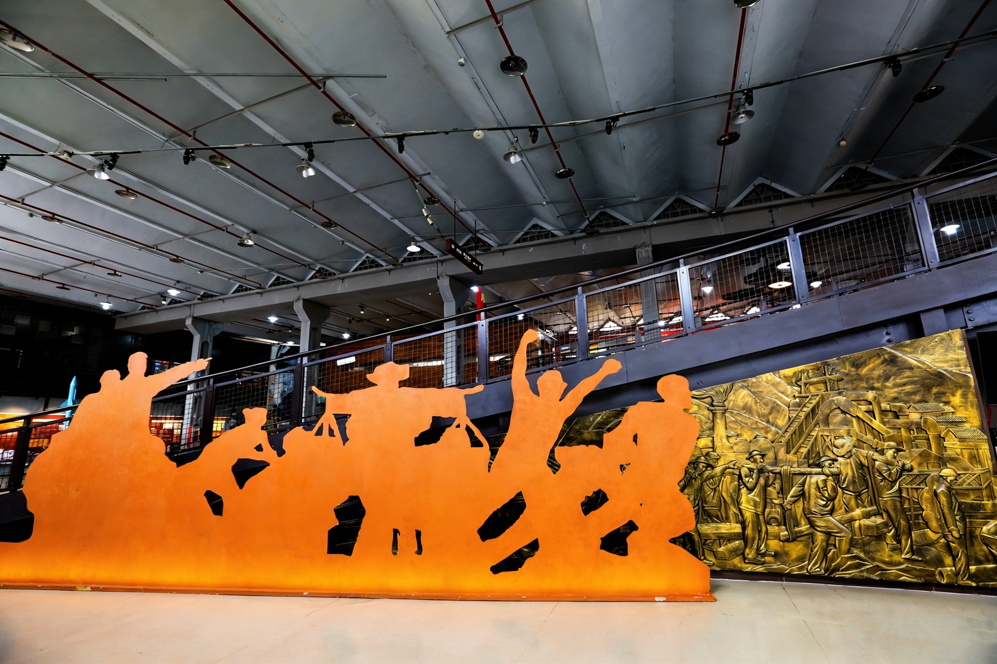 橙色剪影还原出三线建设者的奋斗姿态,后方的浮雕则生动刻画了建设者们开山筑路、建厂生产的场景,这里没有小清新和诗意浪漫,感受到的都是属于那个年代的奋斗热情。