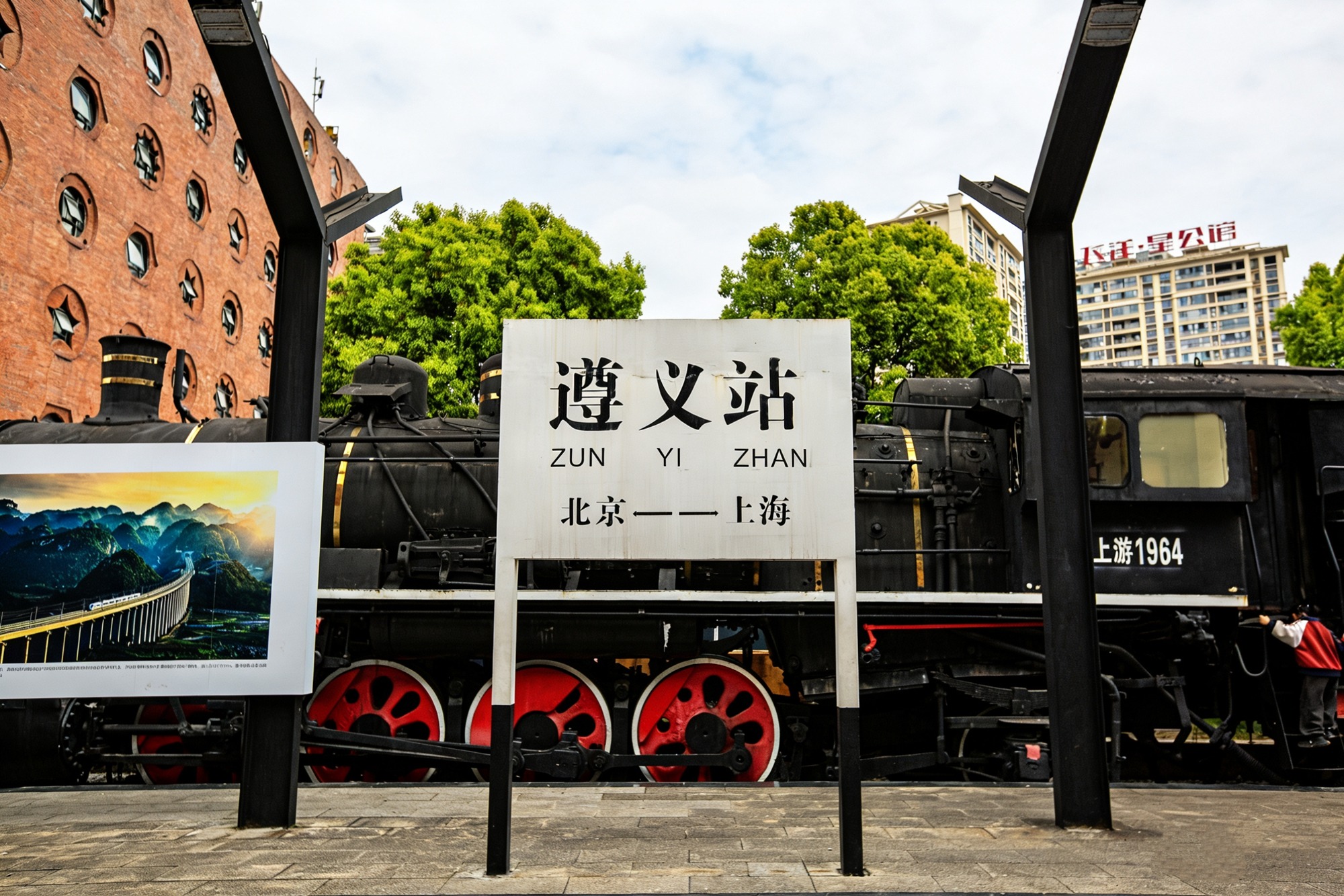 站牌复刻了老遵义火车站的站牌风格,黑白配色简洁醒目,北京至上海的线路标注显示出当年遵义作为西南交通枢纽的重要地位。