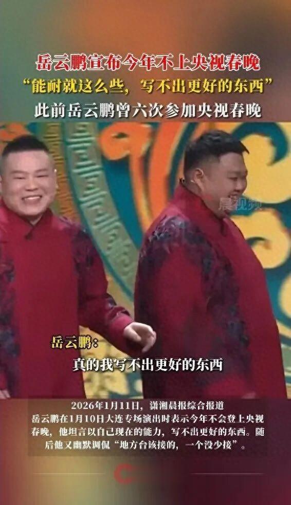 1月11日,据潇湘晨报消息,岳云鹏在1月10日大连专场演出时表示今年不会登上央视春晚,他坦言以自己现在的能力,写不出更好的东西。