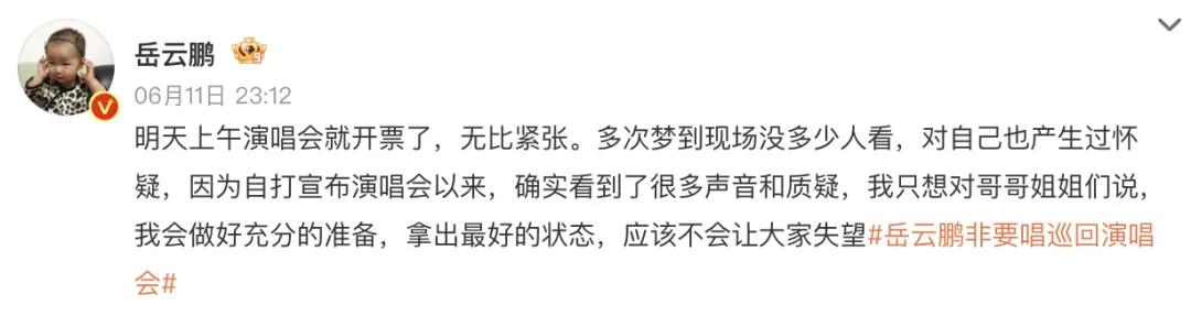 11日晚,岳云鹏再发文回应质疑:“明天上午演唱会就开票了,无比紧张。多次梦到现场没多少人看,对自己也产生过怀疑,因为自打宣布演唱会以来,确实看到了很多声音和质疑,我只想对哥哥姐姐们说,我会做好充分的准备,拿出最好的状态,应该不会让大家失望。”