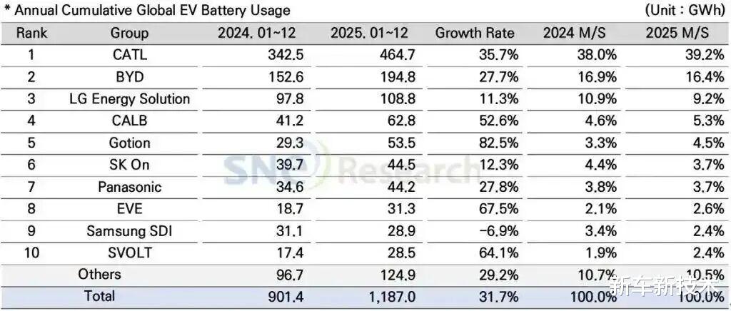 比如,动力电池领域,根据韩国研究机构SNE Research及动力电池应用分会的统计数据,2025年全球动力电池装车量约1187 GWh,同比增长31.7%。其中,六家中国企业(宁德时代、比亚迪、中创新航、国轩高科、亿纬锂能、蜂巢能源)合计市占率达到70.4%,首次突破七成,远超60%的基准线。