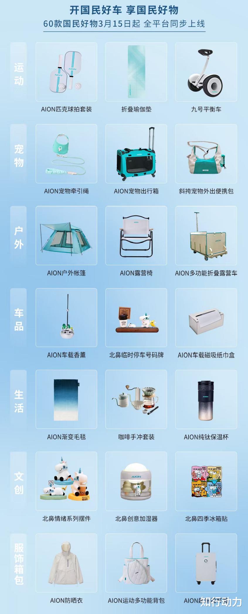 这次埃安的动作很实在,没有花哨的概念,而是瞄准了近 200 万车主的真实用车需求。全新亮相的 “国民好物” 是最贴近用户的一环,60 多款产品覆盖了户外露营、萌宠出行、车品生活等多个场景,从露营椅、宠物出行箱到车载香薰、纯钛保温杯,件件都是车主日常用得上的东西。