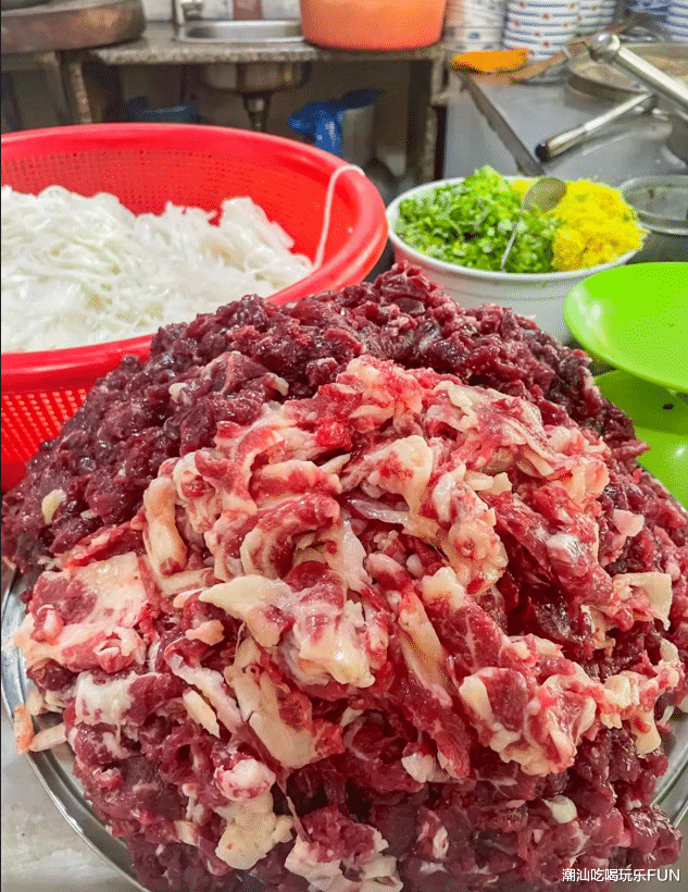 如果有的宝子不太喜欢吃内脏,那他家的牛肉粿条绝对是你的菜。现切的牛肉薄如蝉翼,在热汤里轻轻一涮,就变得鲜嫩多汁。它的口味比牛杂粿条要清淡一些,喝一口汤,能感受到牛肉的鲜甜和汤底的醇厚。