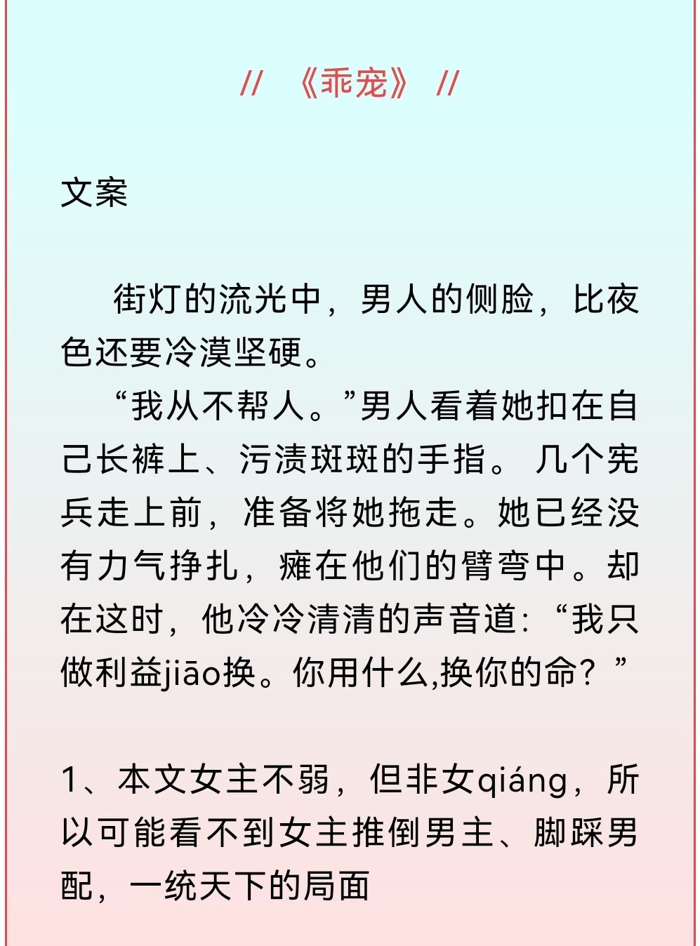 大家好!这里是小说搬运工。现在为大家推荐的是,由作者丁墨创作的《乖宠》,想必这位大大大家都不陌生,由她执笔的多部作品已经影视化了。但是我入坑这本书时,并没有听说过大大的盛名也尚无影视化的作品。完全被小说中宏奇的想象和人物情节故事折服。其间战斗和抒情的部分都处理的很好。人物也是鲜明,各司其职。真的强烈推荐大家入坑。