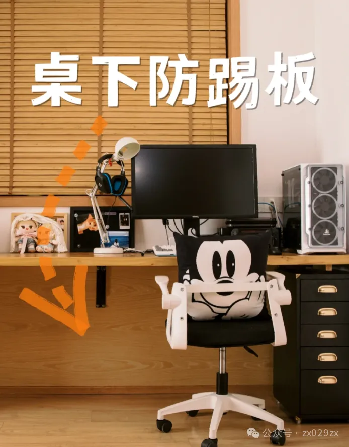 如果进深够的话,可以淘一个超薄书架,书桌下方既满足了书籍收纳,也能防止长期踢脏墙面,成本比较高。