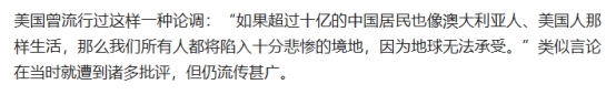 比如,美国社会曾流行一个论调,一旦中国十多亿人过上和美国一样的生活,那对人类将会是一种灾难,因为地球根本承受不了。