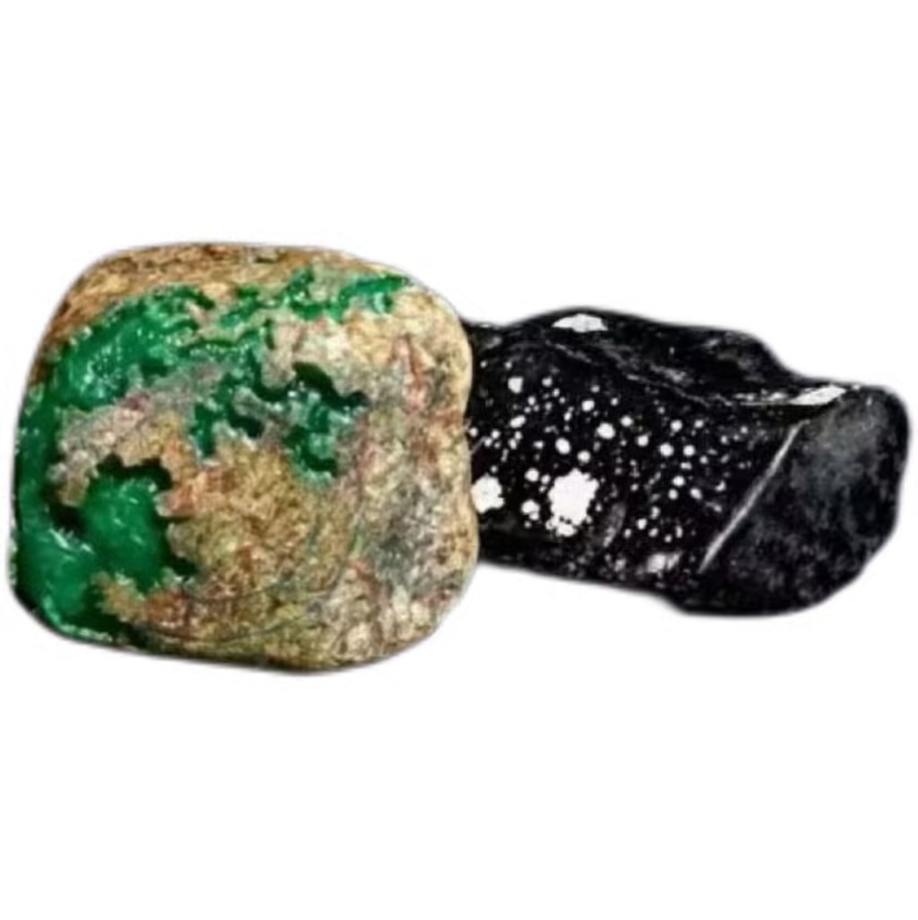 黑乌沙皮壳:如图片中右侧的黑色皮壳,表面乌黑油亮,常带白色斑点(俗称“白蟒”)。这类皮壳多见于帕敢场区,是“赌色”的典型代表——内部可能藏着帝王绿,也可能是一片灰黑,风险与收益并存。
