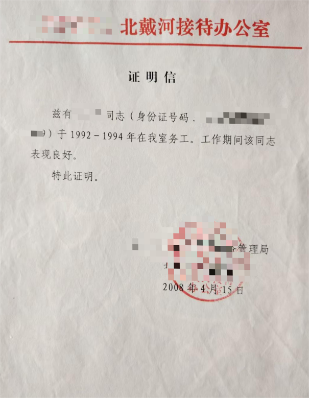 2008年,张某伟再次前往北戴河管理处,管理处仍未就安置问题给出公开处理意见,仅于2008年4月15日出具《证明信》,由北戴河接待办公室盖章确认,证实张某伟1992年至1994年在该处务工且工作表现良好。此后多年,张某伟持续联系原北戴河管理处及上级主管单位,相关诉求依旧未能得到解决。