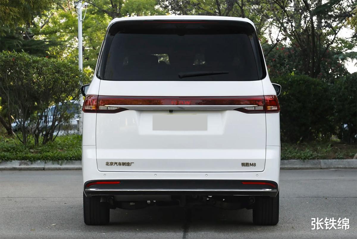 尾部造型简洁干练,车顶带尾翼,提供了后雨刮,尾灯为横贯式的设计,中间带内内嵌的发光字母车标,还使用了贯穿式镀铬装饰。值得注意的是,此前北京汽车制造厂旗下的212以及锐胜品牌车系尾部字标都是手写体,而在这辆锐胜M8上开始使用了新的标准黑体样式。