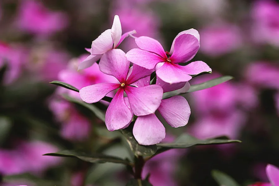 长春花是一种四季常绿的植物,它喜欢充足的阳光和水分。定期浇水并保持盆土湿润,长春花喜欢生长在肥沃的土壤中。