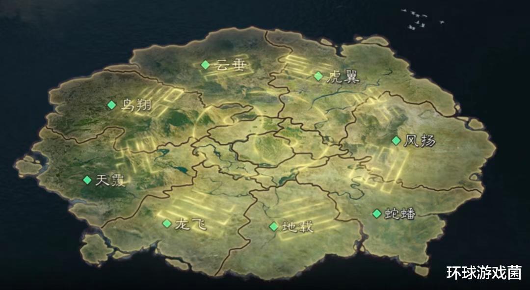 服务器采用全新地图,整个世界就是一个巨大的八卦阵,八个起兵州分别对应武侯八阵——天覆、地载、风扬、云垂、龙飞、虎翼、鸟翔、蛇蟠,名字全部取自《易经》六十四卦。青龙、白虎、朱雀、玄武四大资源州环绕其中,最核心的"中宫"包含太极、阴、阳三郡。这布局,跟诸葛八卦村的"钟池为太极,八巷为八卦"简直如出一辙!