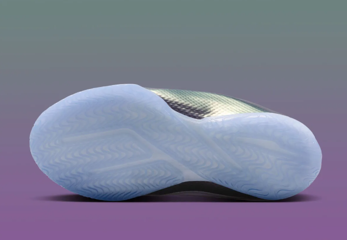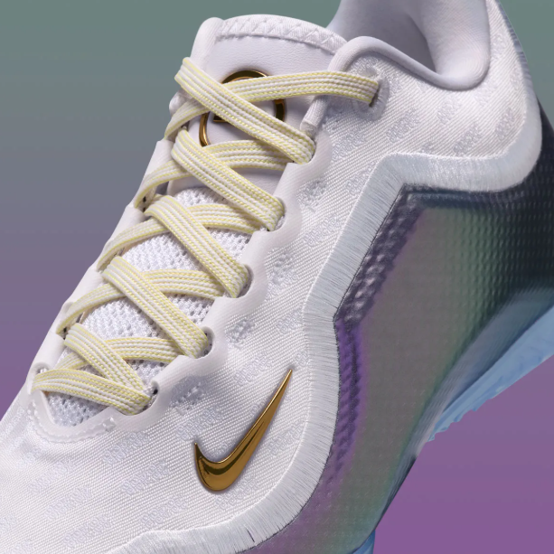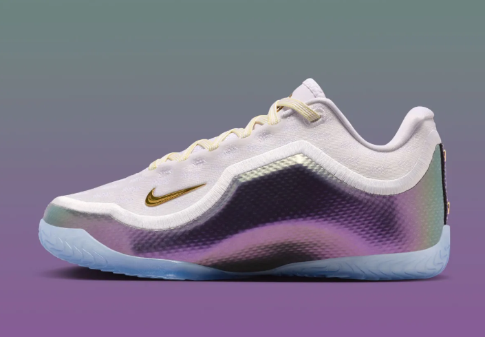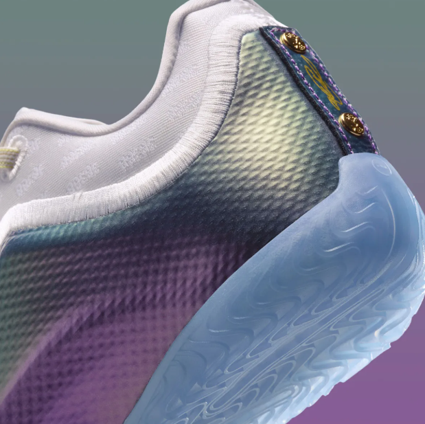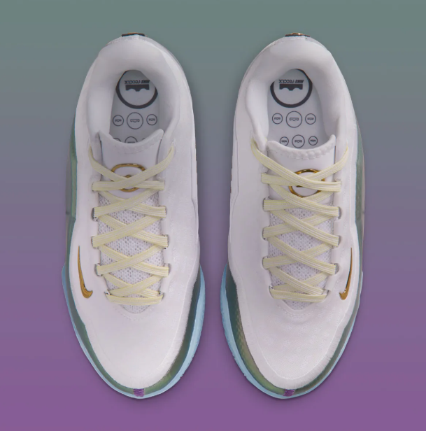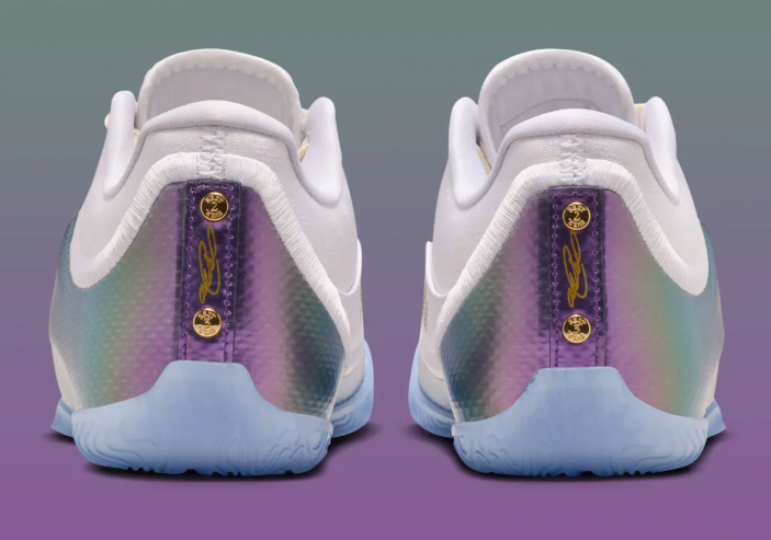 鞋履上部采用了几乎纯净的白色作为其主色调,搭配上鞋履侧面的彩虹紫包裹,形成了其独特的色彩结合,这种色彩设计确实让人感受到眼前一亮;此外,淡黄色的鞋带设计,以及鞋履鞋舌部分的金色元素,也为整个鞋履的帅气添彩不少,从颜值来讲,这款配色绝对是非常合格的。