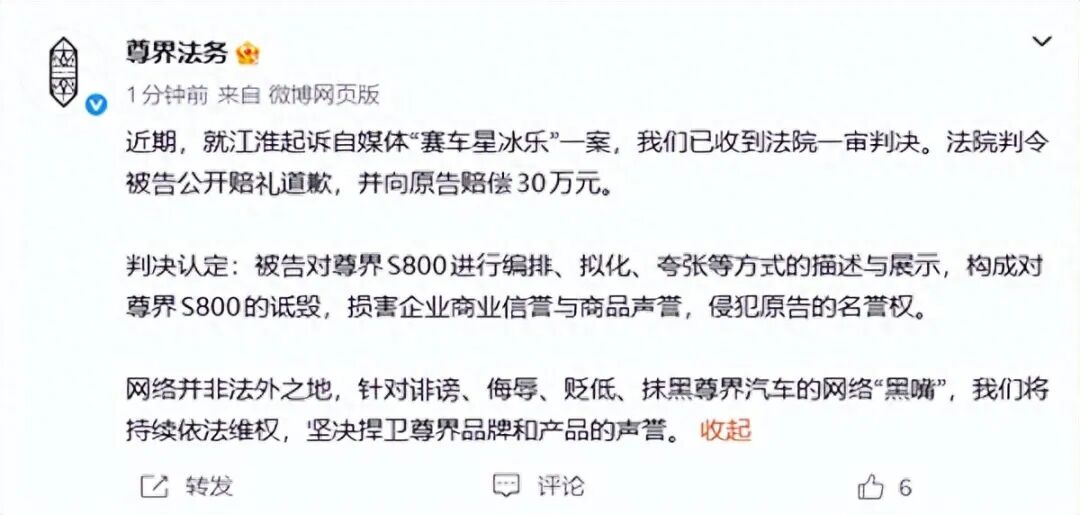差不多同一时间,尊界汽车也公布了维权成果。此前在网上叫嚣要“反诉索赔250万”的自媒体“赛车星冰乐”,最终被判赔30万元,同样需公开致歉。