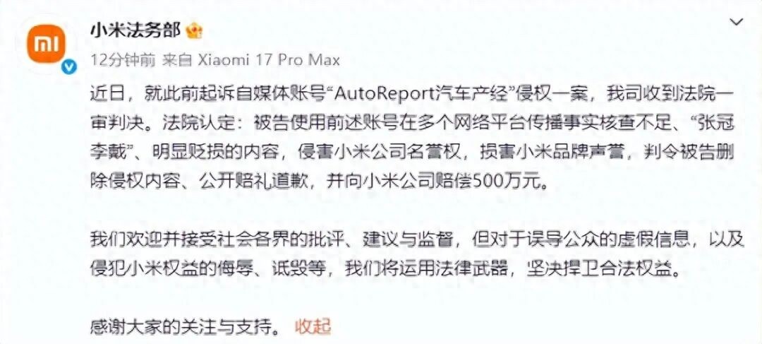 2月24日,小米公司法务部门对外透露,一审判决已经下达,长期发布针对小米不实内容的自媒体“AutoReport汽车产经”,被法院判处赔偿500万元,同时需删除侵权内容并公开道歉。