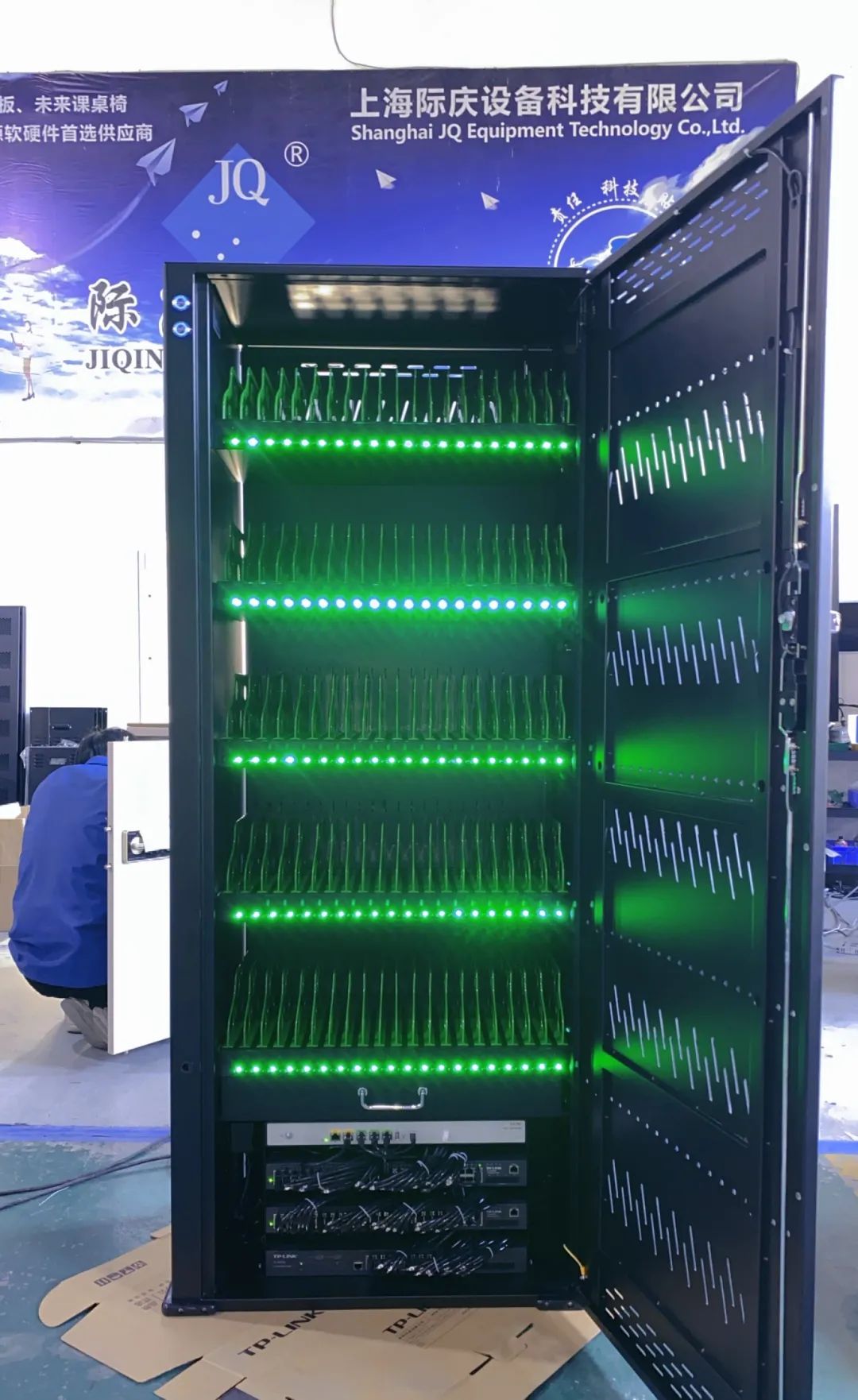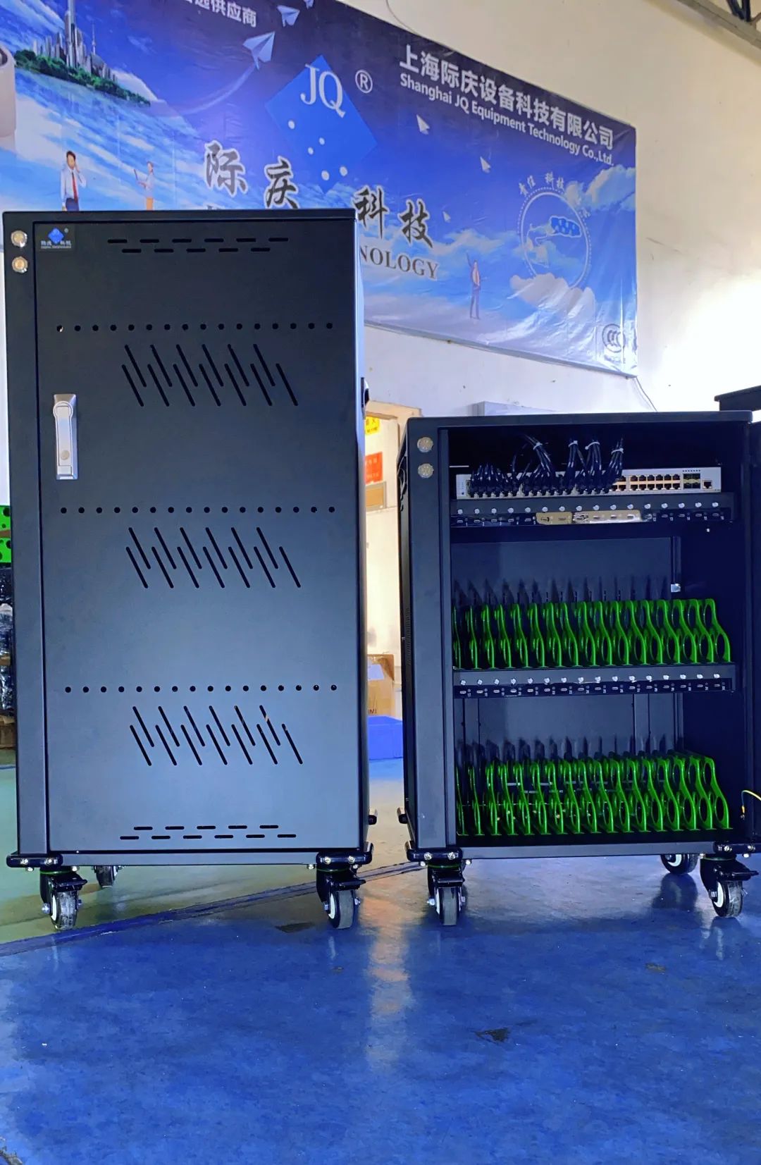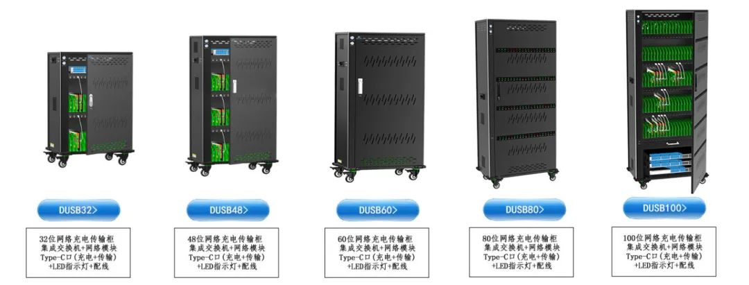 际庆科技专业从事10多年充电柜系列产品及配套的生产制造,拥有最专业的研发团队,时刻紧跟市场需求,率先推出智能网络充电传输柜,它集成Type-C充电口模块+交换机+网络模块于一体,在给平板电脑充电+存管的同时,还能连接网络,实现数据批量分发和上传。