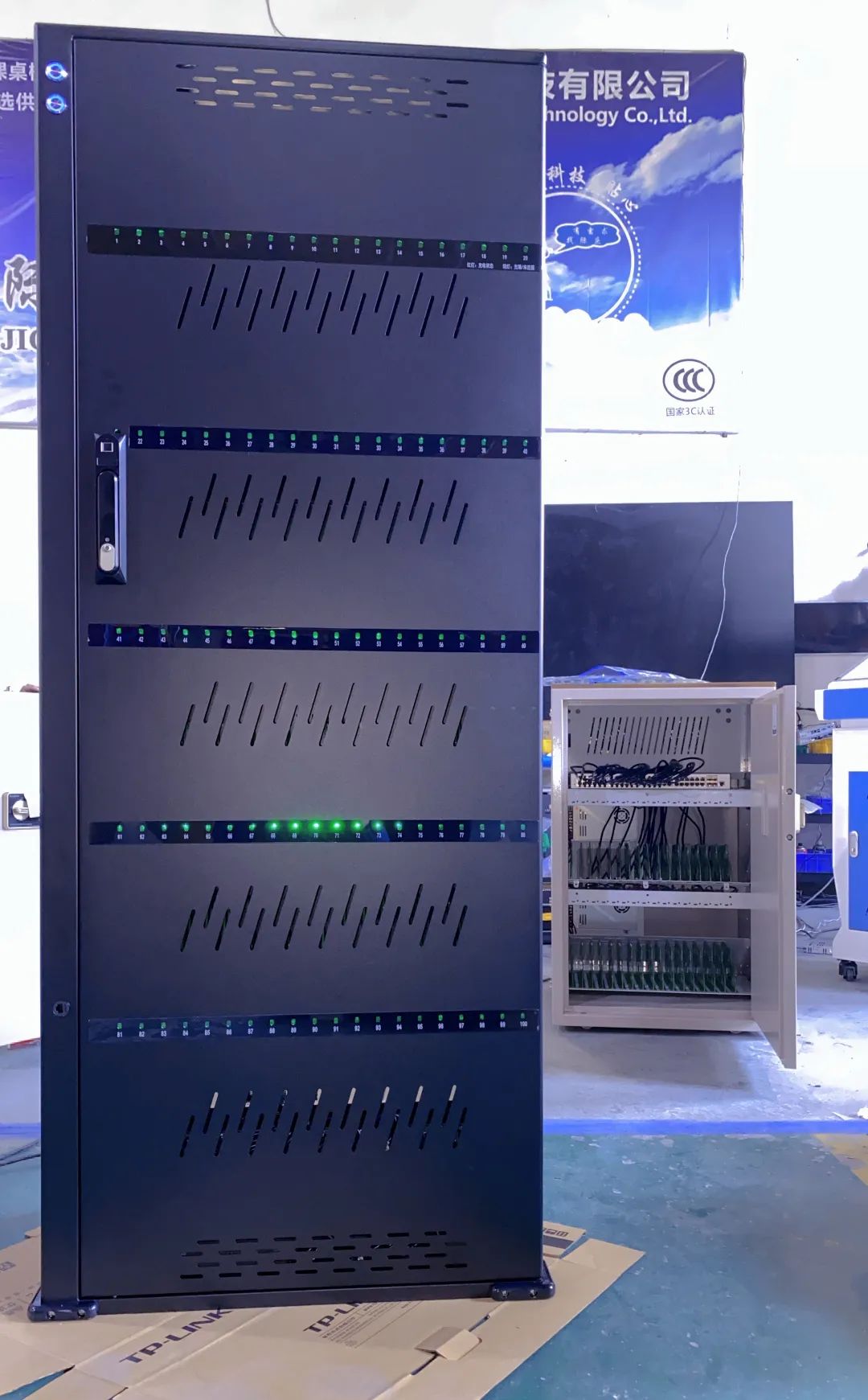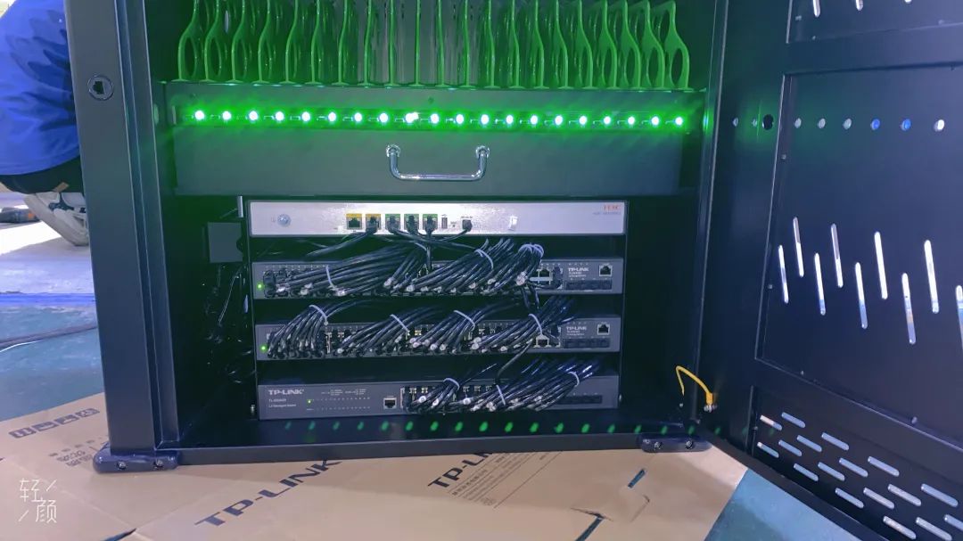 智能网络充电传输柜内置交换机+网络模块,通过交换机IP管理功能,可以实现32/48/60/80/100台正在充电的设备处于同一局域网下,搭配第三方WEB管理系统或者办公自动化软件(OA)来管控,可以满足涉密场景下,相关人员能高效办公和处理日常事务,在实现数据的下发和上传的同时,支持32/48/60/80/100台设备集中充电;当交换机连接有外网的路由器时,又可以通过路由器的自动分配IP功能,实现给多台设备集中供网。(工位支持定制)