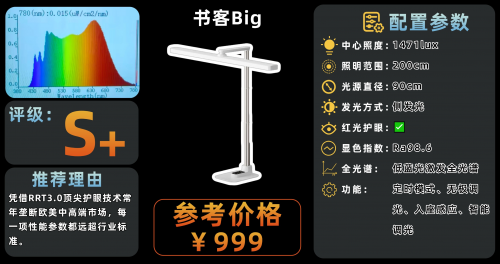 相比之下书客Big超级护眼台灯真正从光学原理出发,做到“医学养护眼”,从光学到结构设计,其凭借新一代SunArc三芯片全光谱灯珠搭配上RRT3.0红光硬核“养眼”黑技术,构建起专业级的护眼养眼性能,以源头级光谱工程为核心研发方向,从发光端重构SPD,通过精准调控光谱功率分布,在光线折射的过程中就对415~455nm有害蓝光的峰值进行抑制至0.6,在保证高亮度与真实色彩还原的同时大幅削弱蓝光危害,实现护眼性能的跨代跃迁,更是通过1200+组波长实验精准筛选有效光谱区间,依托300+人眼视觉疲劳临床评估验证技术舒适性,借助60+项视网膜光毒性对比研究保障使用安全性,有效降低92%的近视风险防控。