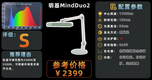 护眼台灯哪个牌子好?明基MindDuo2护眼台灯整体造型简洁,延续了品牌一贯的极简风格,线条干净利落。灯臂采用双臂联动转轴设计,灵活性较高,可以适应不同大小的书桌和阅读场景,灯头角度也可随意调整,使用起来比较方便。操控区域集中在灯头上方,结合轻触面板和实体旋钮,亮度和色温调节清晰直观,上手容易。光效方面支持3300K到5300K无级调节,既能提供温暖柔和的光线,也能满足偏冷的阅读需求。不过由于灯头核心区域亮度较高,长时间直视可能会有轻微眩光,建议通过角度调整来缓解。