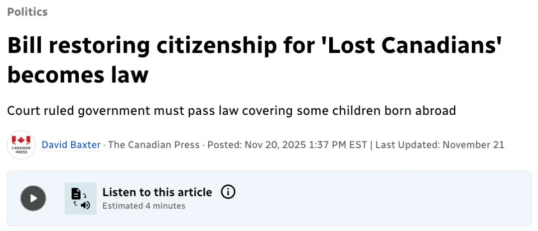 这条规则后来在2023年12月被安省高等法院裁定违宪——因为它人为切断了很多家庭的血缘传承,造成了一批“理论上应是加拿大人,却拿不到加拿大护照”的「失踪公民」。