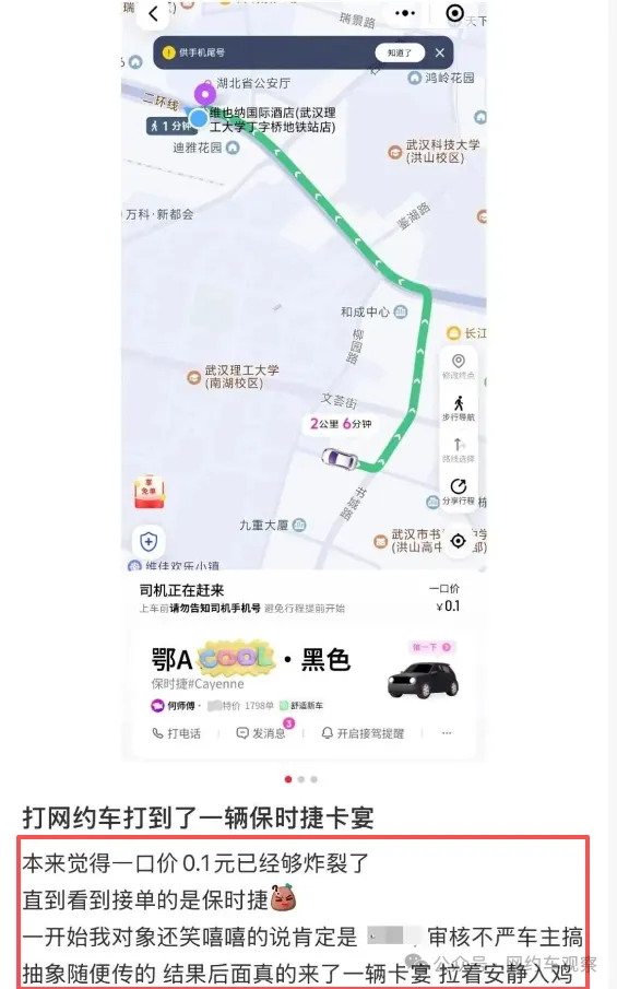 打一口价网约车就一定“臭”吗?近日武汉一名女乘客只花0.1元就打到了保时捷卡宴据乘客介绍当时系统显示“一口价0.1元”她就觉得不可思议看到来车是保时捷时更惊讶等车时平台问要不要换司机她才等四五分钟就果断选了留下原来行程基础费不到8元用了平台满减券最后实付0.1元