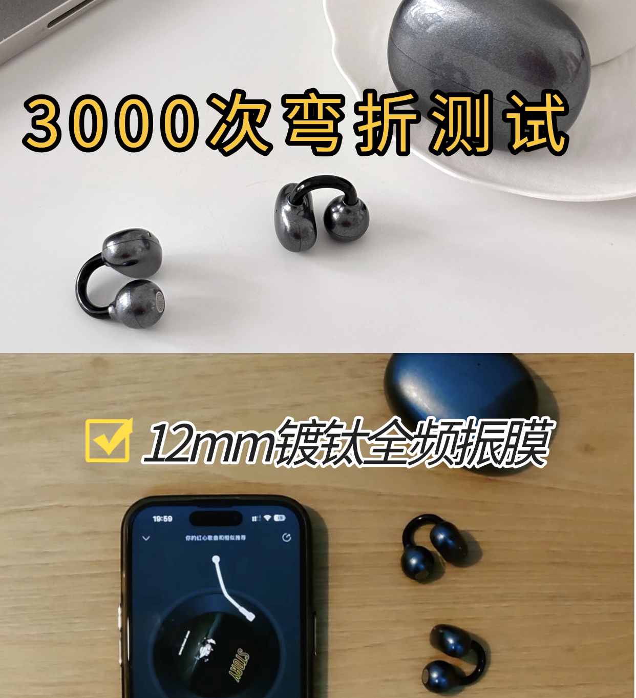 0.6mm镍钛记忆钢丝+人体工学耳夹,单耳5g,珍珠白、琉璃黑等配色颜值高。佩戴稳固,亲肤不压耳,侧躺无明显硌感;IP56防尘防水,日常耐造;