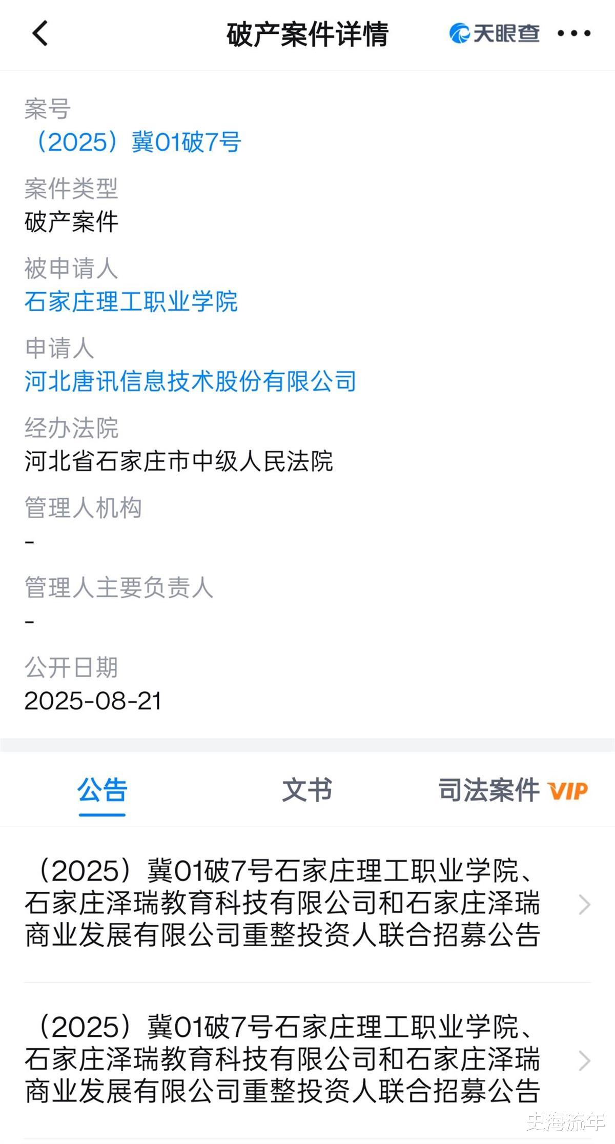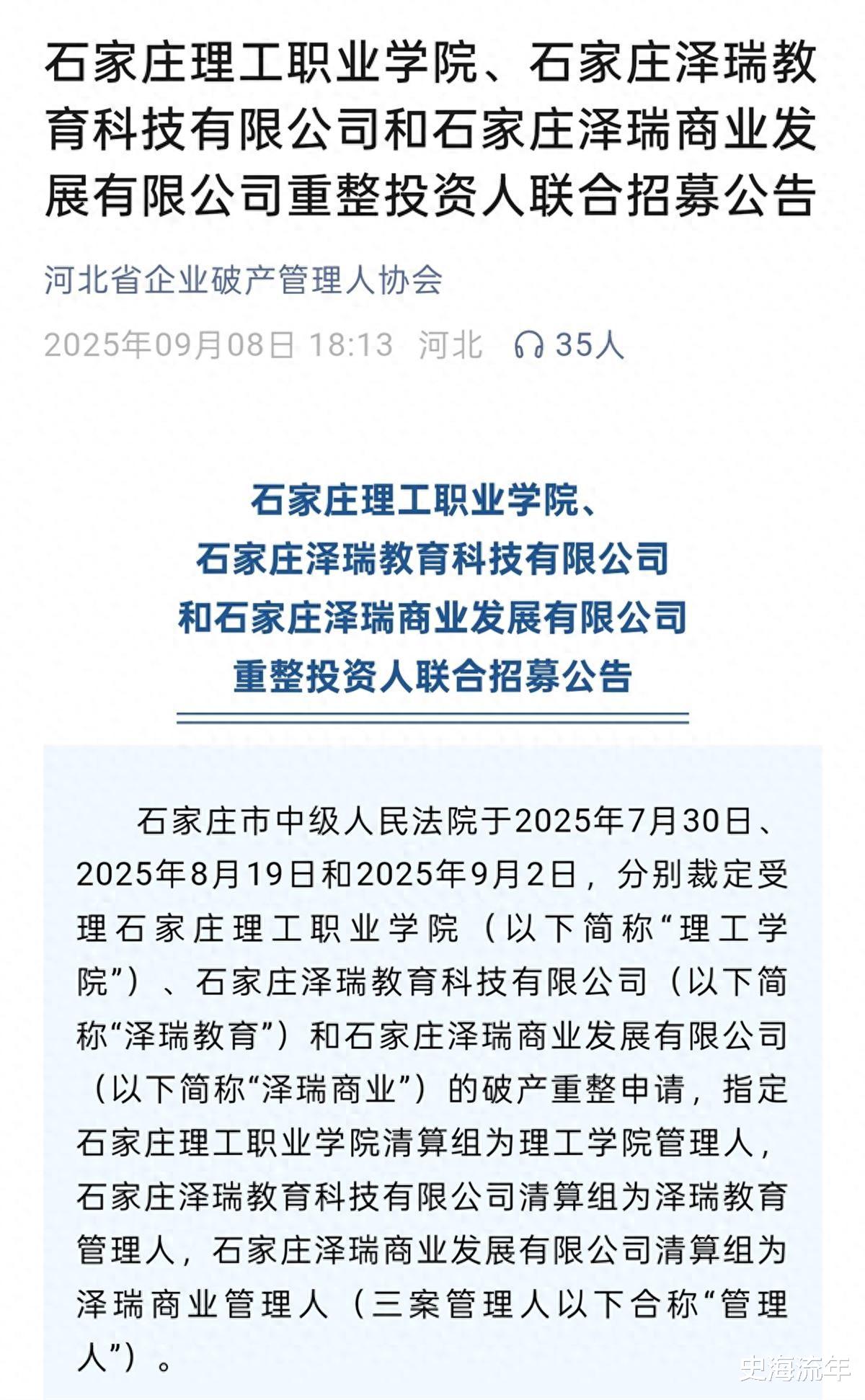 在校生的利益得到保障,教学如常,权益不受冲击。对于两万余名在校生而言,重整风波未影响正常教学秩序。9月22日校方确认,已找到重整投资人并由政府接管,“不然学校也不会正常运转”,各项教学工作按计划推进。河北省教育厅明确表态,政府与教育部门将切实保障学生利益,不会让教学受影响。