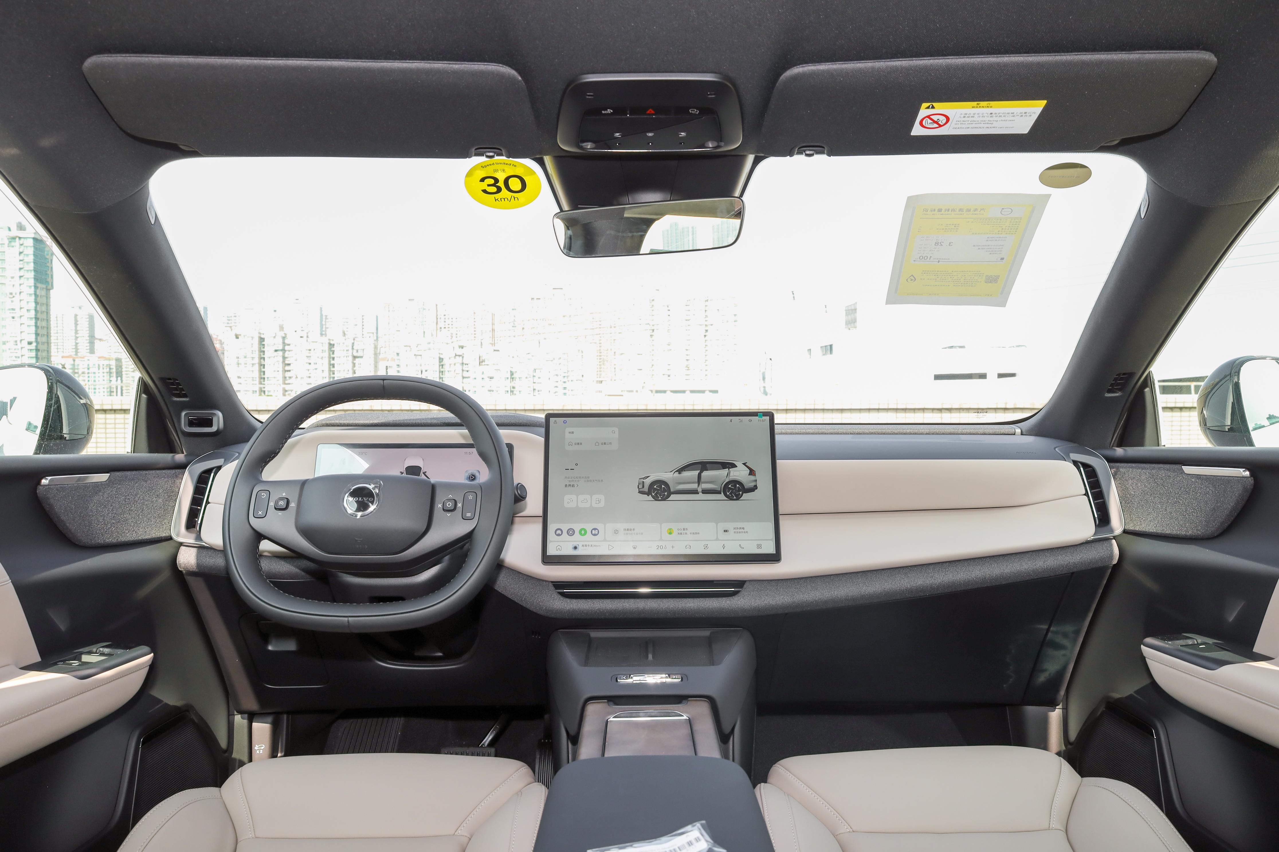进入车内,内饰设计秉持“安全、健康、简约”的核心理念,整体布局规整,操作逻辑清晰。大面积软性材质包裹的中控台搭配仿皮座椅,触感温润舒适,消费者也可选择升级为真皮或Nappa真皮材质,进一步提升内饰质感。方向盘采用皮质材料,支持上下与前后调节,多功能按键布局合理,操作便捷。电子式怀挡设计节省了中控台空间,让前排腿部活动更显自由。车内配备7色氛围灯,可根据驾驶模式自动调节,为驾乘环境增添温馨感,全车多层隔音玻璃有效隔绝外界噪音,营造出静谧的车内氛围。内饰的健康属性同样值得关注,座舱材料禁用四类有害物质,搭配超低温室效应制冷剂,从源头减少污染隐患,契合可持续发展的理念。细节处,车内门板储物格、中央扶手箱等多处储物空间设计合理,方便存放手机、水杯等日常物品,兼顾美观与实用。