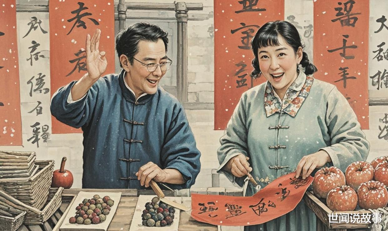 这一天啊,正好是腊月二十三,又是个年集。集市上有一对老年夫妻在卖对联。这男的呢,是学校的语文老师,姓王,可有文化了。这不,学校放假了,快过年了,就出来摆个摊写几副对联,赚点外块,他老婆就在旁边帮忙裁纸、收钱。那时候的东西可便宜啦,大门上贴的对子也就五毛钱一副,小门上贴的也就两毛钱。收的钱好多都是硬币呢,这夫妻俩就弄了个孙子吃奶粉的铁筒来放钱。这钱一收,就往这铁筒里一扔,“叮当叮当”的。