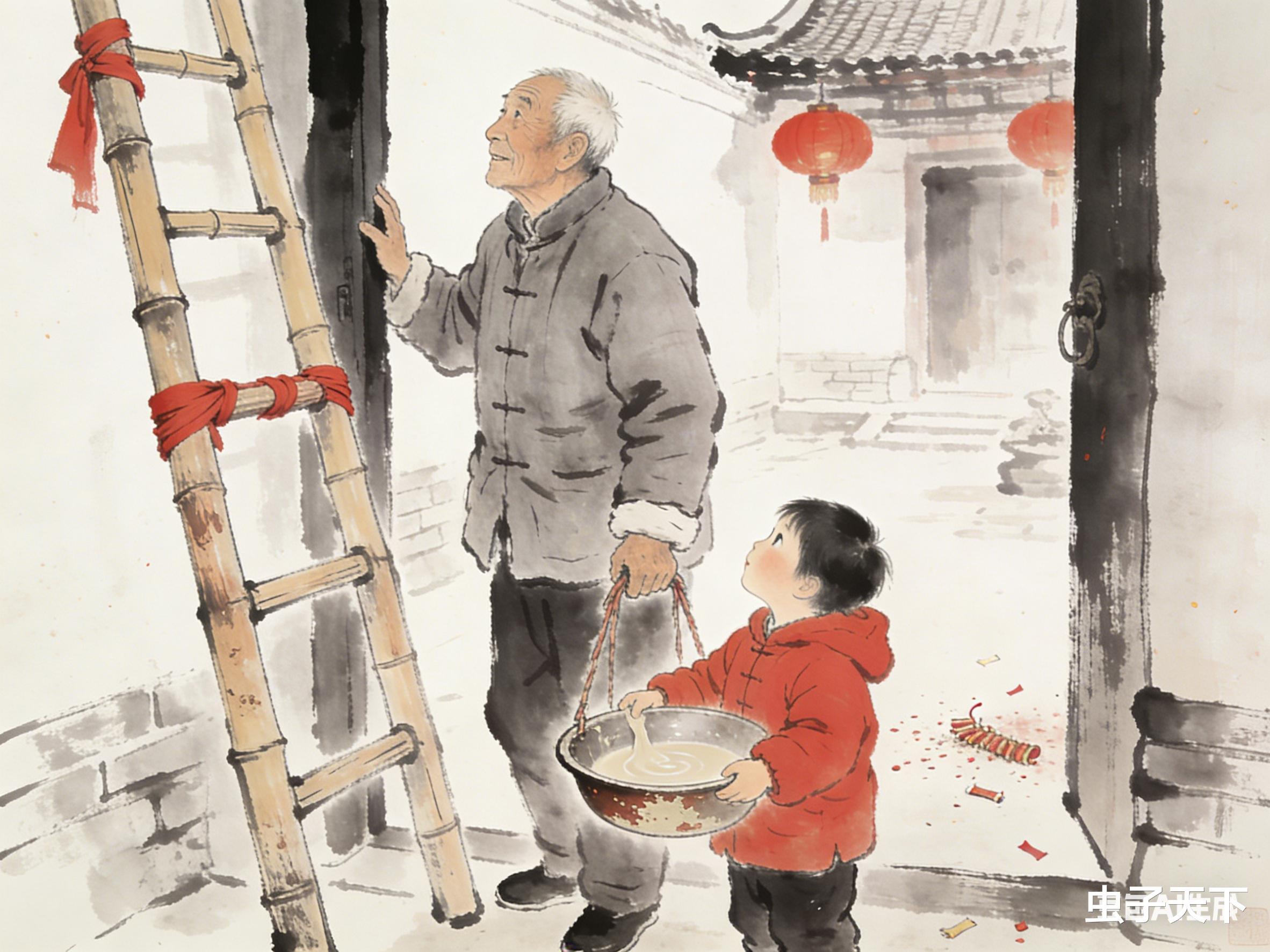 老刘头拎出那把用了三十多年的竹梯子,梯子腿缠着老伴儿生前缠的红布条。