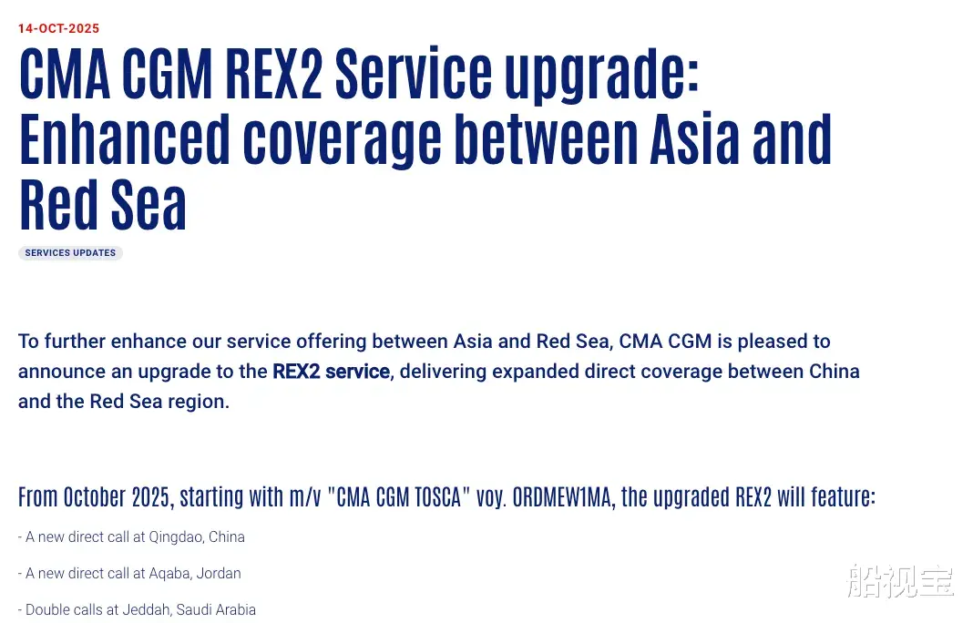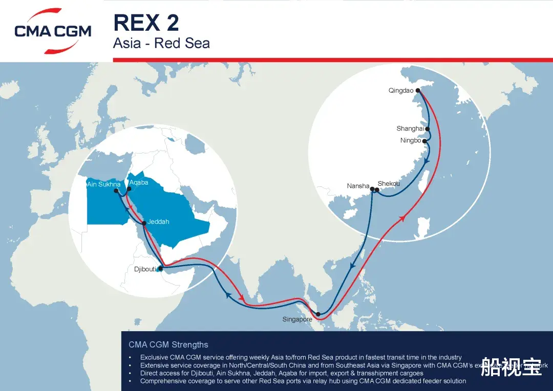 10月14日,CMA CGM在通知中告诉客户,为进一步提升亚洲与红海之间的服务,CMA CGM 宣布对REX2服务进行升级,提供更广泛的直航覆盖范围,连接中国与红海地区。
