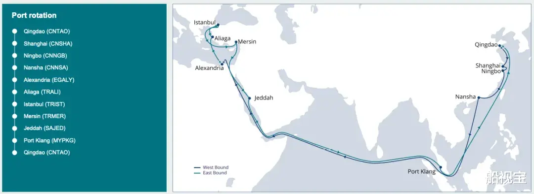 航线安排包括青岛、上海、宁波、南沙、亚历山大港、阿利亚加、伊斯坦布尔、梅尔辛、吉达和巴生港,然后再返回青岛。