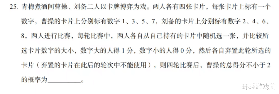 像是你在中学时代学的数学语文,就能再次派上用场;从影视剧和演义中学来的三国知识,同样能帮助你攻克几道难题。为了让“考生”们更有代入感,出题人甚至还专门编了一个青梅煮酒时发生的野史,问你曹操和刘备打牌时获胜的概率是多少。