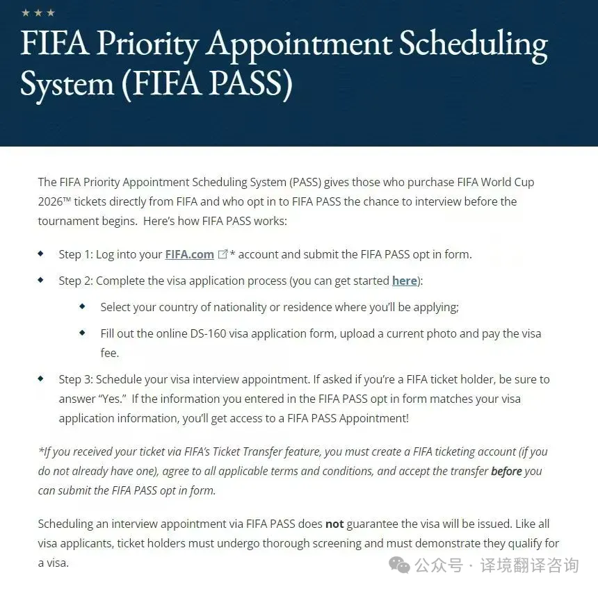 先澄清一个关键误区:FIFA PASS不是“保过通道”,也不是免审核,只是帮你缩短面签预约时间(部分领区60天内就能约到,比常规快一半以上),审核标准和普通美签一致,但找对专属细节,能大幅提升通过率和效率 。01 仅官方球票可激活通道,非正规票直接失效