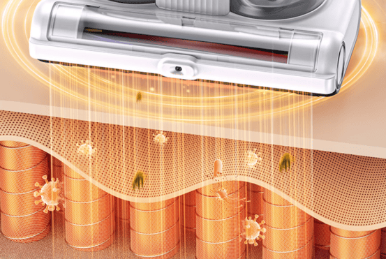 核心配置上16kpa超强吸力搭配63000次/min高频拍打频次,直透深处,尘螨毛发分秒间即可吸走,75℃智能控温迅速加热,有效抑制螨虫生长;在其他的除螨手段上,紫外线LED + 超声波,既能快速扫除菌螨,又能破坏菌螨生存环境,从根源上解决菌螨。