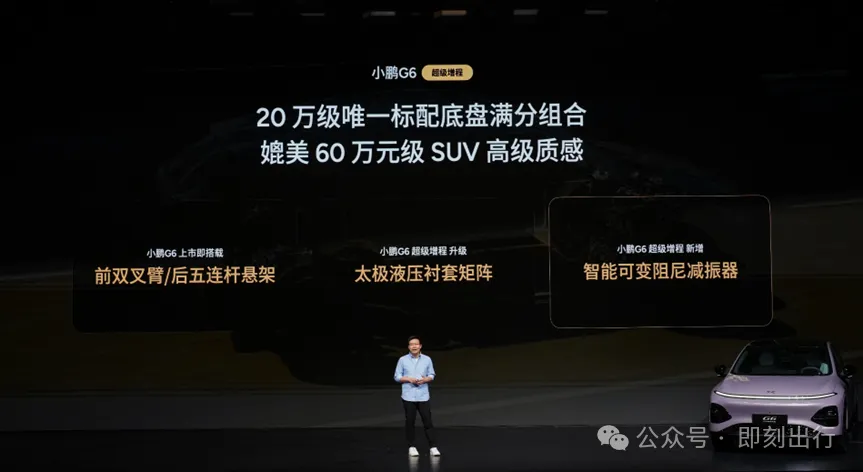 立足家庭用户驾乘需求,小鹏G6底盘完成全面进化,从专注单人运动操控,升级为全家舒适驾乘兼顾。新车全系标配太极AI底盘,拥有20万级唯一标配的前双叉臂/后五连杆独立悬架+太极液压衬套矩阵+智能可变阻尼减振器满分组合,底盘质感媲美60万级豪华SUV,让每一位驾乘者都能拥有舒适体验。