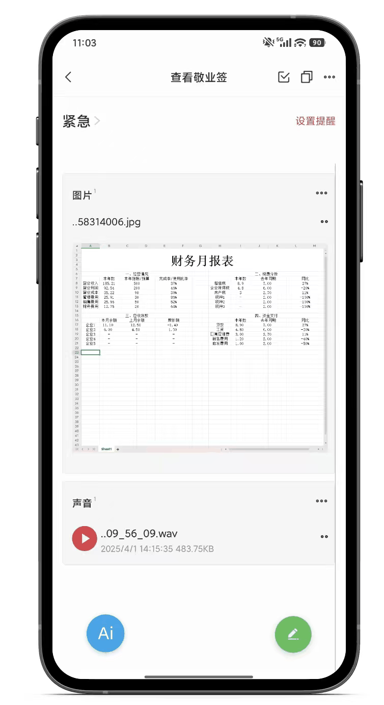 为什么敬业签会是数据收纳的好帮手?因为它支持多格式统一存储。在敬业签中,单条便签不仅仅是一个文本框,更可以在记录文字的同时,在附件中上传图片、音频、视频、office全家桶等多格式文档和文件。这意味着,相关的资料可以放在同一便签,这让你的重要数据可以集中都存放在敬业签中,避免了四处翻找的麻烦
