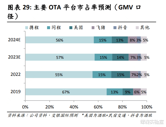 而美团和携程虽然在酒旅市场是直接的竞争对手,根据交银国际研报预测,2024 年国内OTA市场中,携程以56%的GMV市占率稳居第一,同程、美团、飞猪分别占15%、13%、8%。