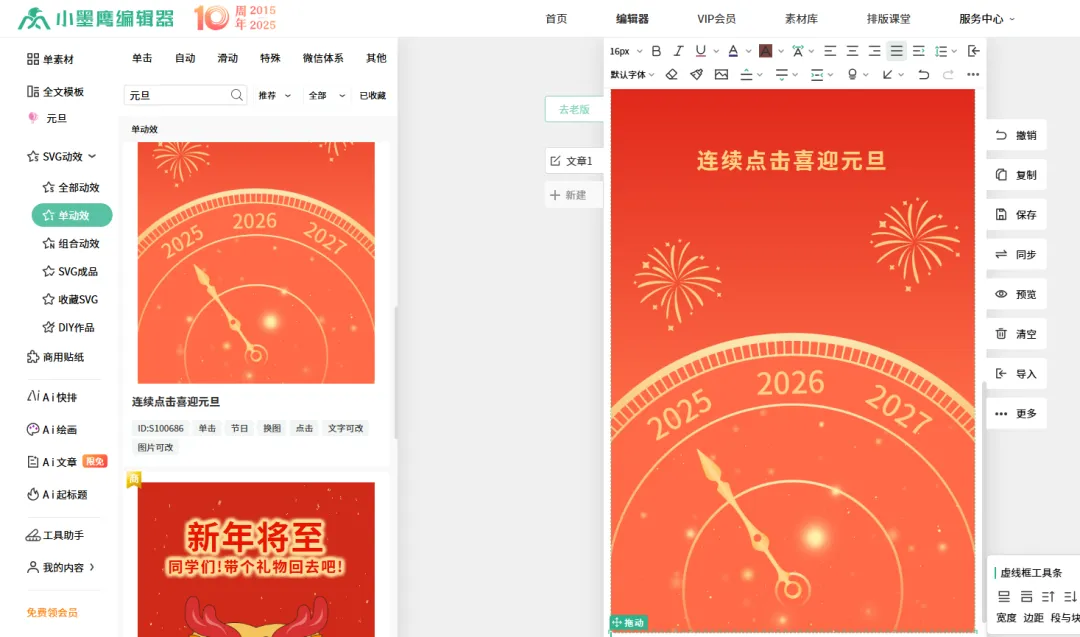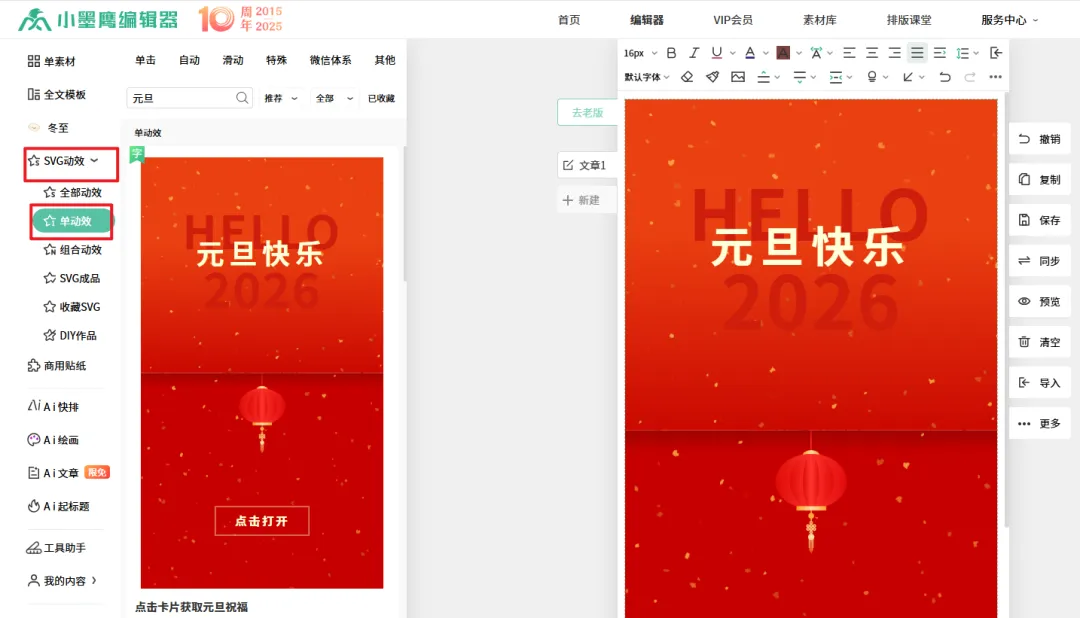 实现这个效果,我们用到的核心技术是 SVG互动。别被名字吓到,在小墨鹰里操作非常简单。打开小墨鹰编辑器,进入你要编辑的文章。将视线移到左侧的工具栏,找到并点击 「素材」 或者 「SVG特效」 分类。在顶部的搜索框里,输入精准的关键词进行搜索。最有效的组合是:“换图” + “元旦” 或 “新年”。你也可以试试 “切换”、“对比” 这些词。