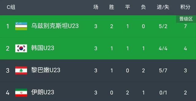 在比赛开始前,C组的形势已经十分明朗。前两轮比赛过后,韩国队和乌兹别克斯坦队同积4分,凭借净胜球优势,韩国队暂时占据榜首位置。而伊朗队则以2分位列第二,黎巴嫩队则因两战皆负积0分垫底。然而,随着乌兹别克斯坦在第三轮比赛中以2-0的比分击败韩国队,积分榜的格局发生了根本性的变化。