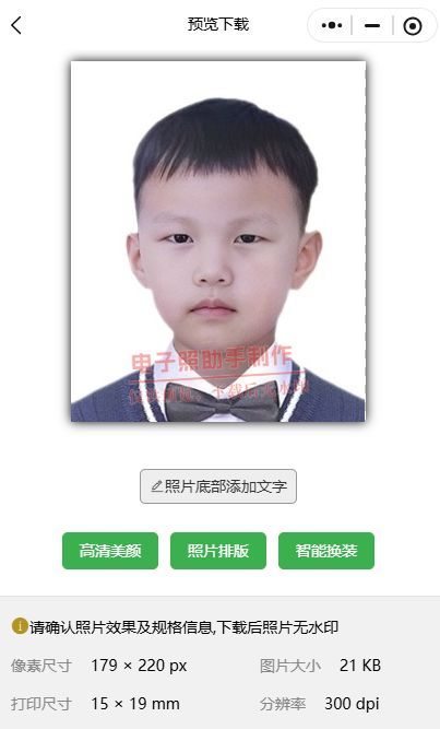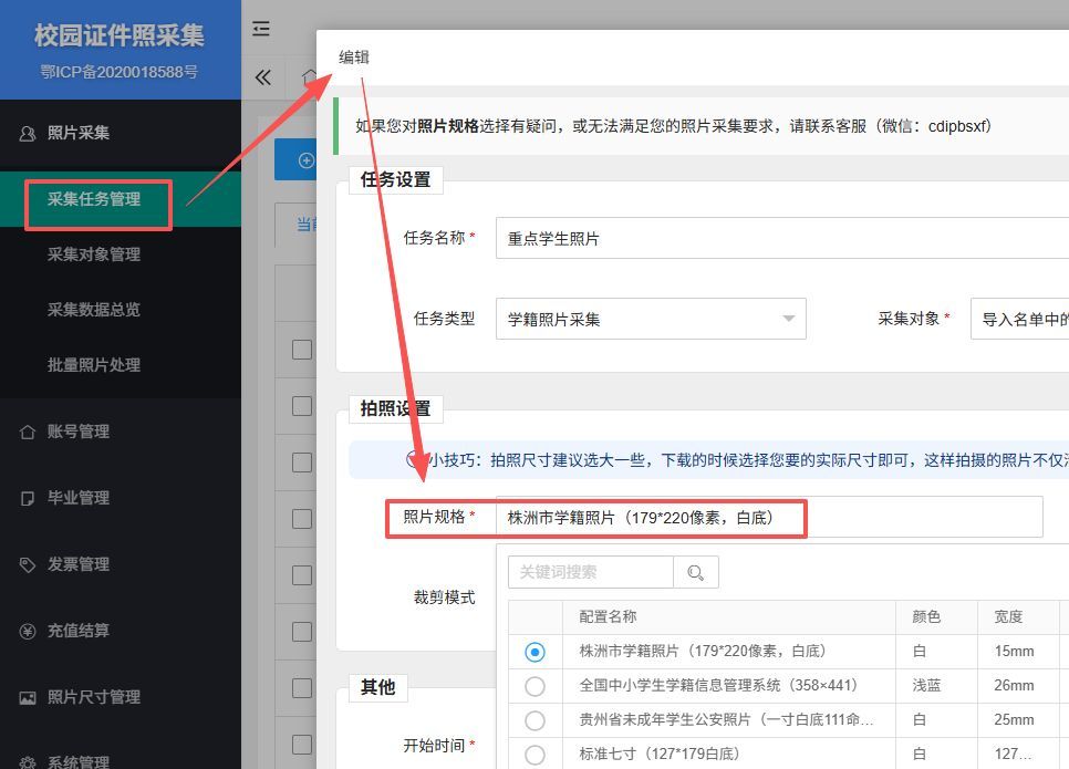 这里注意将“照片规格”选择为:株洲市学籍照片(179*220),这样后续拍完照片就会自动处理成学籍平台要求的规范格式,包括浅蓝色背景、文件大小、头顶距离、头部比例等,直接下载就是符合要求的照片文件。